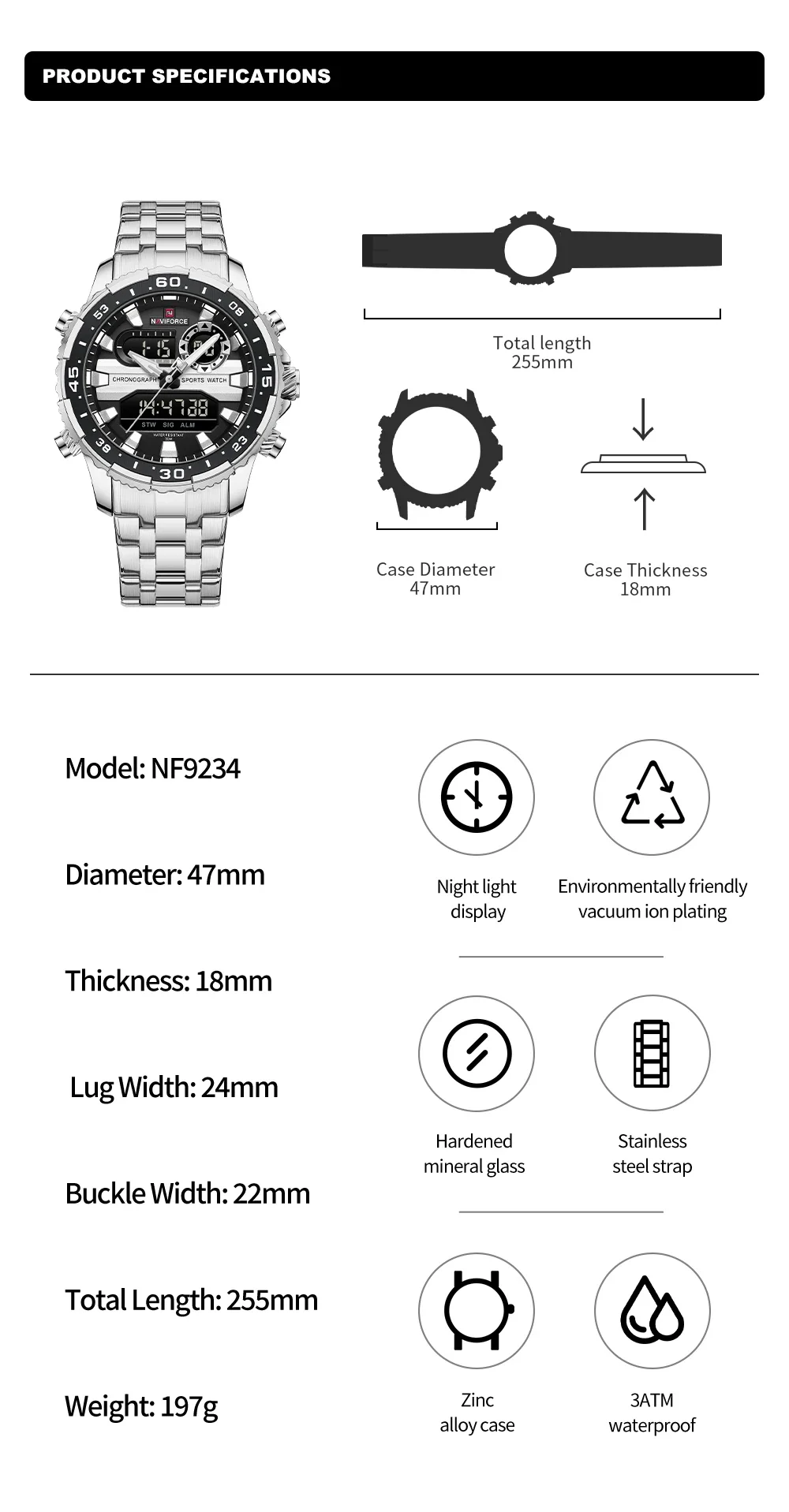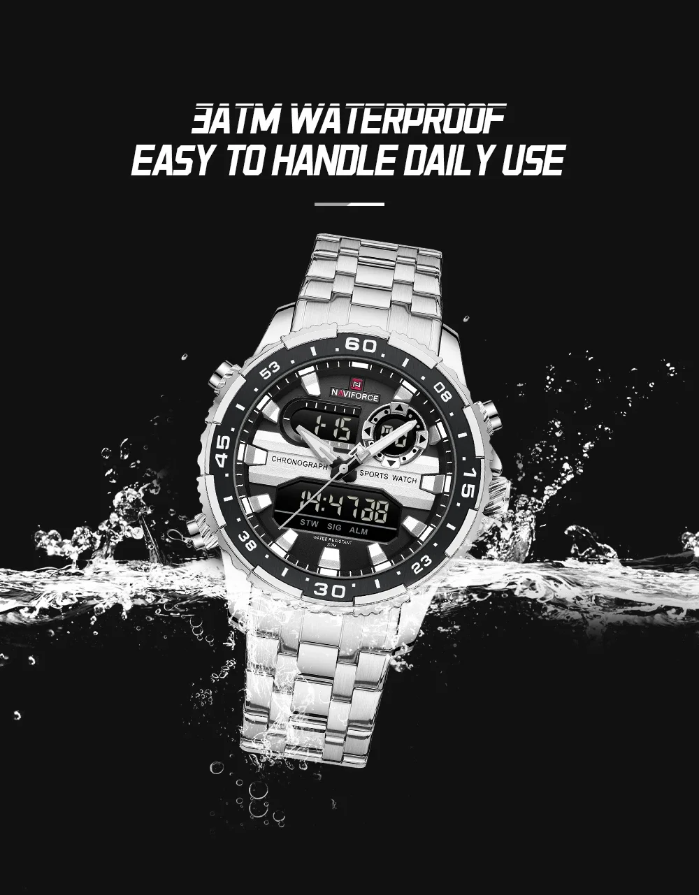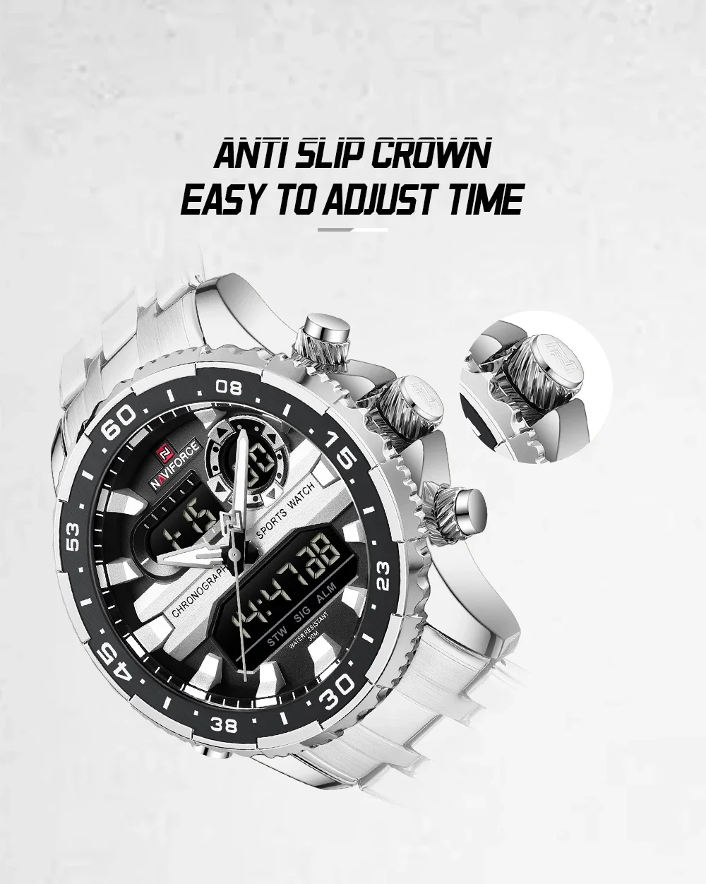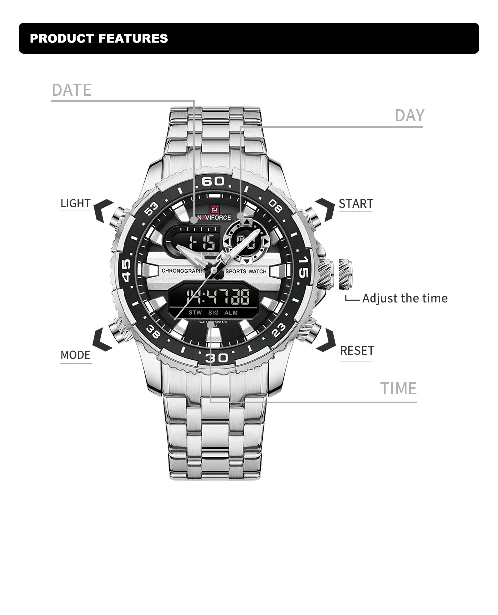 Be the first to review “NAVIFORCE NF9234 Original Trend Brand LCD Display Analog Digital Quartz Man Clock 30m Waterproof Luminous Wristwatch”